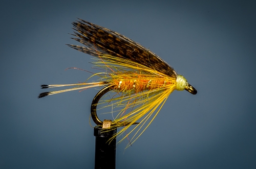 A sample photo of a Golden Olive wet fly taken with no diffuser in place. The light is a little harsh on top of the wing and on the head of the fly, but since the light is so focused on the fly itself, the background darkens dramatically and the fly jumps out of the image. I kind of like this. Care needs to be taken with exposure to ensure the fly is not blown out by the dark background. Always take a few test shots and check before shooting a bunch of flies.