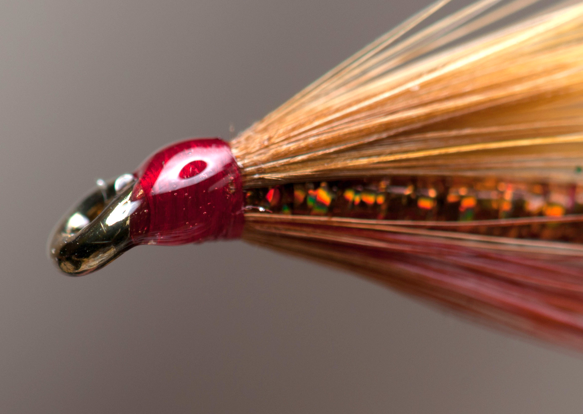 Repeat the process if necessary, touching the bare or thinly covered spots until the head is fully covered. Never apply so much that it runs! You want many small and well controlled drops rather than one, big, saggy glob, which will run and create bulge on the underside of the head - or require a rotating fly dryer to keep it under control.