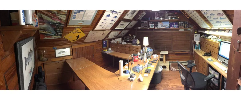 The birthplace of a lot of innovative fleye designs. Bob writes "Tying room is designed to hold my tools, hooks, eyes, TUFFLEYE, and LIMITED materials. I use a small box to hold materials I will need to do certain type FLEYE. You can see it on the table. Keeps a mess to a minimum. Some BUCKTAILS, feathers and flash are located in large drawers along the wall. Computer, tv and video equipment along wall also. Storeroom holds all the bulk of materials. Fishing equipment, bags, luggage, etc. coffee machine, little fridge (not in room yet), lots of books. BTW, forgot to mention rods along the ceiling and in slots along a wall and in hidden cubby holes."
