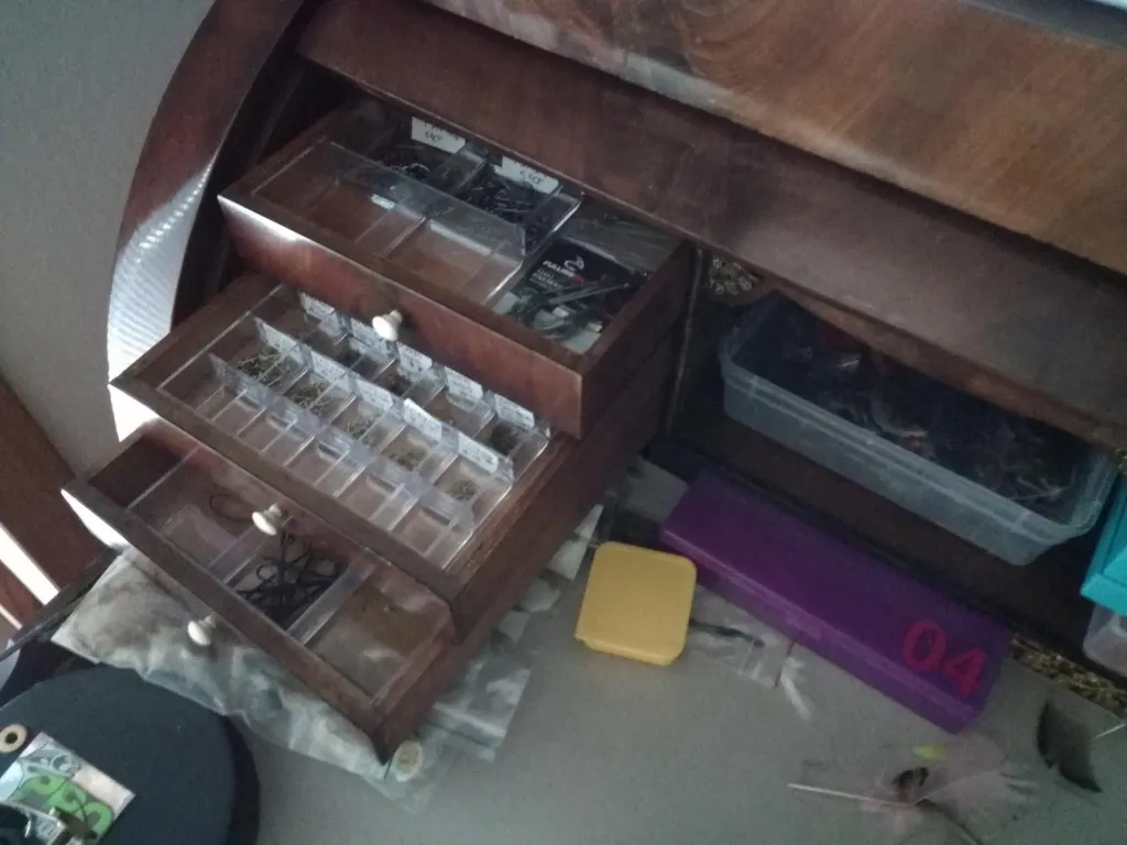 I tye in the bedroom, so I need a lid on my tying station to avoid feathers and hair all over the place. I used to tye on a regal copy but having to locate a size 18 hook, that was shot out of the vise and onto the bed made me buy my current vise. I found my roll top for a mere 300,- dkr.,the seller citing the tableplate being stuck, took a me exactly thirty seconds to make it unstuck, nice. The small drawers hold hooks, beads, eyes, thread and assorted odds and ends and I have one large drawer for hair and fur and another for feathers, leaving the last one for "miscellaneous