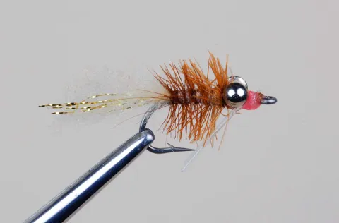 | Tail | Originally tied by Omeko with a tan craft fur tail with a gold and pink blend of Krystal Flash; Orvis now ties it with tan Antron fiber or Fly Fur over a gold/pink blend of Krystal Flash (a pink holographic braid can also be used as a substitute) |