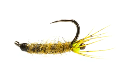 Head and body Get Slotted 1.5mm chartreuse tungsten bead on melted black 12lb Amnesia