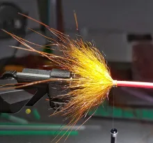 The tying sequence below shows a variation made by Danish fly tyer Kim Sørensen, who has added a small disc in the rear of the fly. This has the purpose of lifting the hair. Marc notes that this makes the collar wider and the fly less willing to sink. Marc himself ties his flies slimmer and tighter. Marc also ties different sizes of the fly, from a Micro Plug to a fly more in tune with most tube flies for salmon.