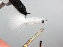 11. Maintain tension as you secure the tinsel and tie in on the bottom of the hook, keeping the tinsel in centerline with the hook.