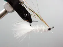 5. Select a clump of marabou to be used for the tail of the fly. Measure the marabou to the hook shank and transfer this length to the hook bend. Proceed to tie in the marabou tail material. Continue making thread wraps over the marabou butts, up the hook shank, stopping behind the eyes. Trim the excess marabou butts and return the tying thread to the bend of the hook.