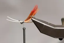 • Strip the soft barbs off a couple of red golden pheasant breast feathers