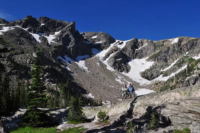 (L to R) Shane Murphy and GFF Partner Steve Schweitzer pause on the rocky banks of Lake Nokoni after their return from hiking over the ridge (upper right hand of the picture) to find and fish Pettingell Lake.