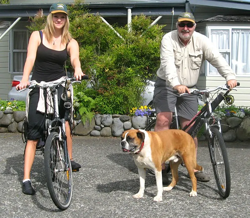 Fishing guide Kicki Lissborg and Australian client Murray Cullen, bikes loaded with gear and ready to take them to the river - along with Boof, the motel dog.