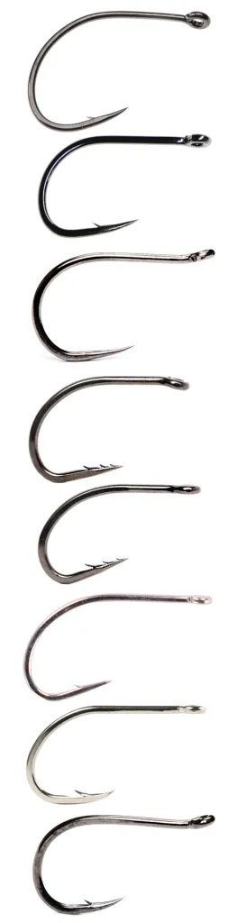 Hooks with a short shank - about the same as the hook gape. Curved, straight, down eye, up, eye and all kinds of shapes. The market is full of options.