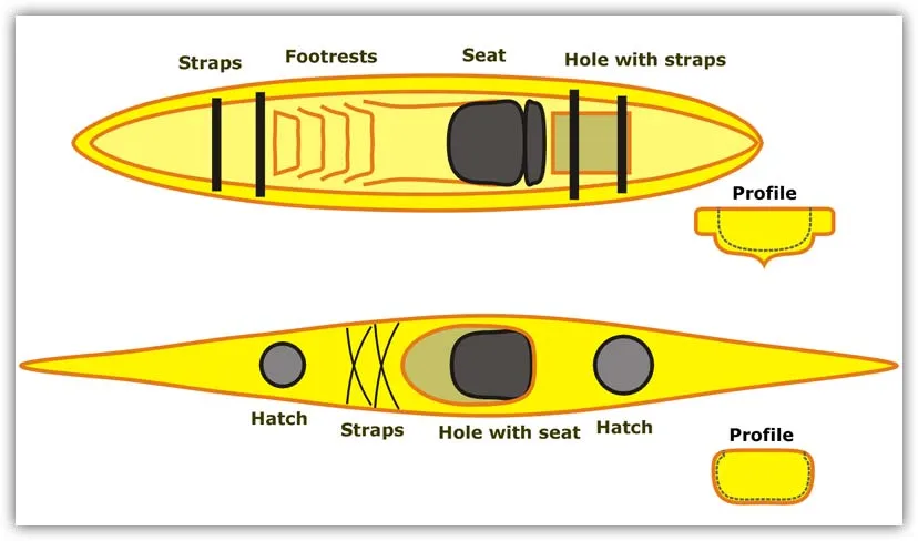 The two basic types of kayaks: open type, sit-on-top (top) and the traditional type (bottom). Apart from one being open and the other closed, it is typical that the open type is shorter and wider than the slender, arctic type, which often is faster and more suitable for long trips.