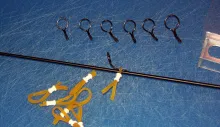 First you have to glue the tip top into place before all further steps. After this I place the guides according to the manufacturer's recommendation, placing the guides temporarily on the blank using the small rubber band constructions that you can see in the pictures.