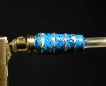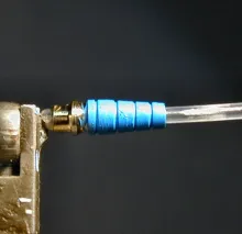 After the glitter is dry then I add the ribbing, in this case in the grooves cut into the tube, I used metallic silver thread for this process. After several unsuccessful attempts to add ribbing I hit upon the idea of double wrapping the thread in the groove and finishing with a single overhand knot to hold it in place. I applied head cement to the knot, let dry and trimmed the excess thread. If satisfied I then epoxied the complete body and let dry.